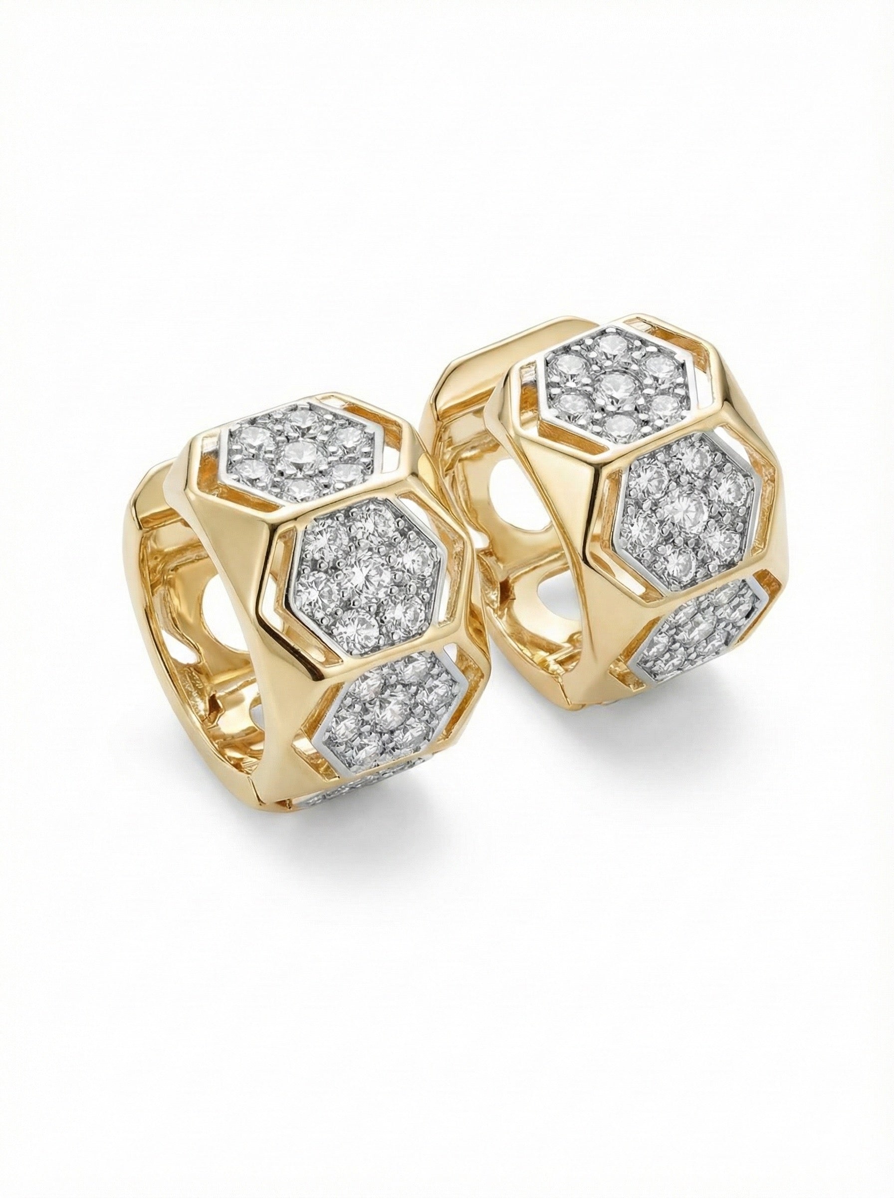 Modern hatların ışıltılı detaylarla buluşması. Klasik halka küpe formuna geometrik bir yorum katan bu tasarım, ön yüzeyindeki yoğun taş işlemeleriyle (pave setting) her açıdan ışığı yakalar. Yan profildeki özel desen işçiliği, tasarıma derinlik katarak sıradanlığın ötesine geçer. Hem günlük stilinize lüks bir dokunuş katmak hem de gece şıklığınızı tamamlamak için ideal bir parça."