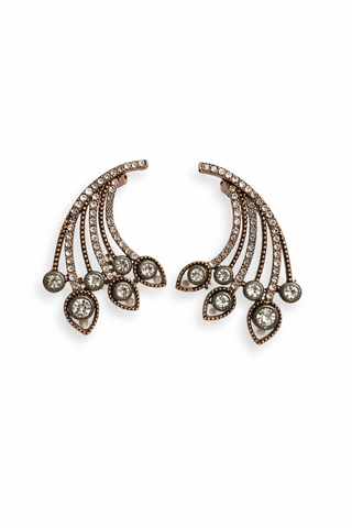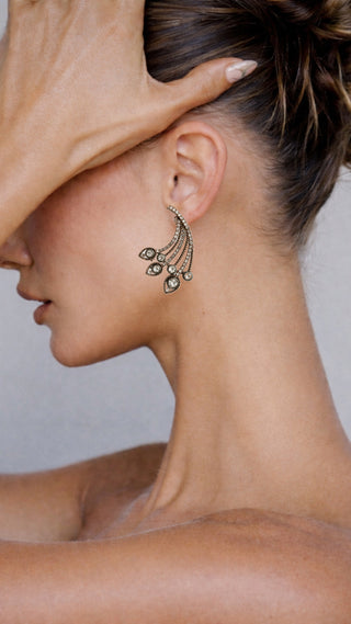 Bronz üzeri altın kaplama yapısı ve kristal taş detaylarıyla tasarlanan bu küpe, kulağı zarif şekilde saran formuyla dikkat çeker. Hafif yapısı sayesinde gün boyu rahat kullanım sunar ve farklı stillerle kolayca kombinlenir.