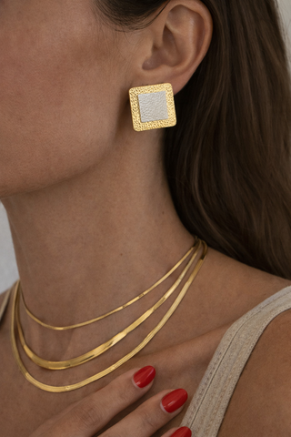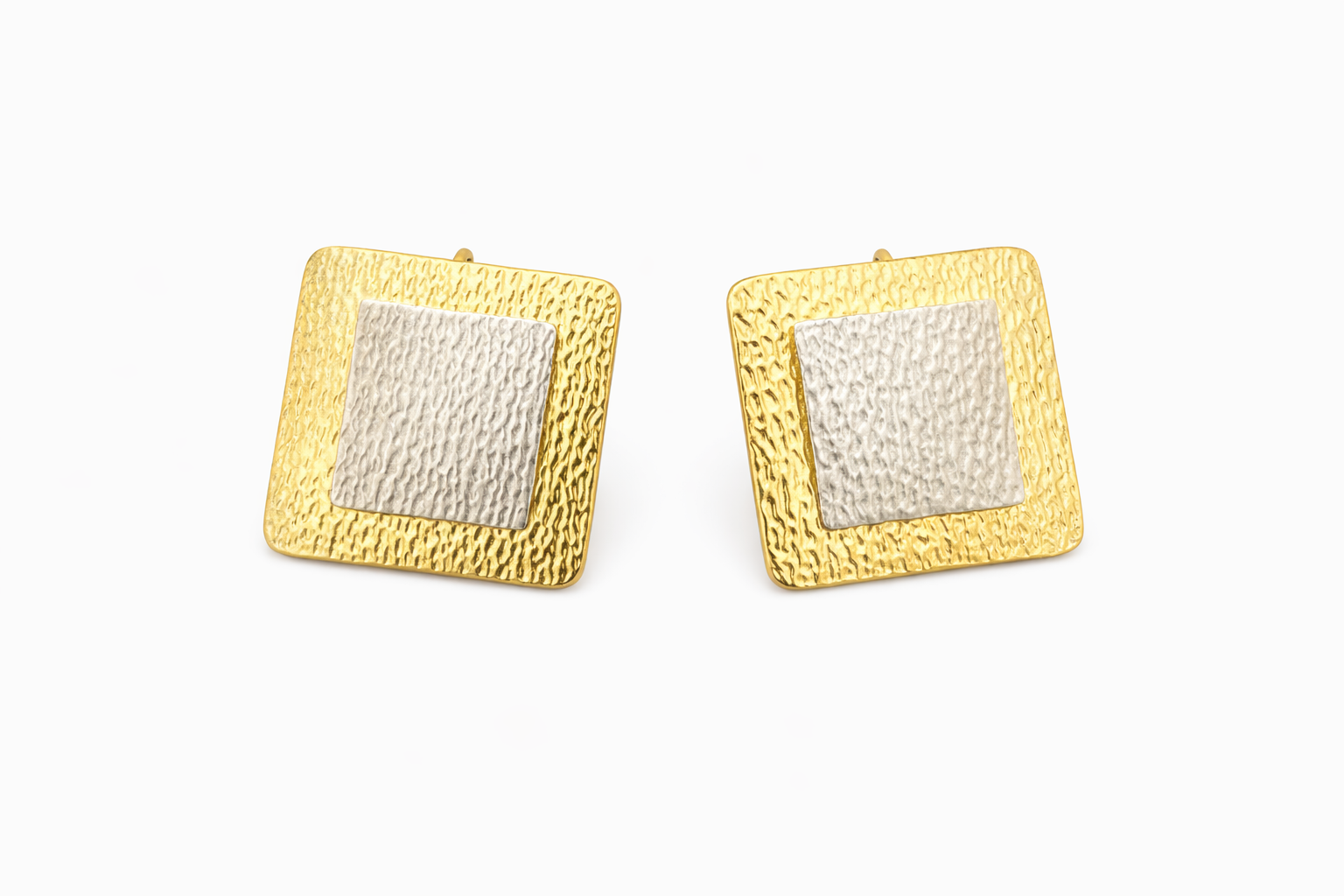 Dokulu yüzeyi ve çift renkli tasarımıyla öne çıkan bu kare form küpeler, modern ve güçlü bir stil sunar. Gold çerçeve ile içteki silver tonlu detayın uyumu, küpeye hem zamansız hem de çağdaş bir karakter kazandırır. Günlük kombinlerden özel davetlere kadar rahatlıkla kullanılabilir