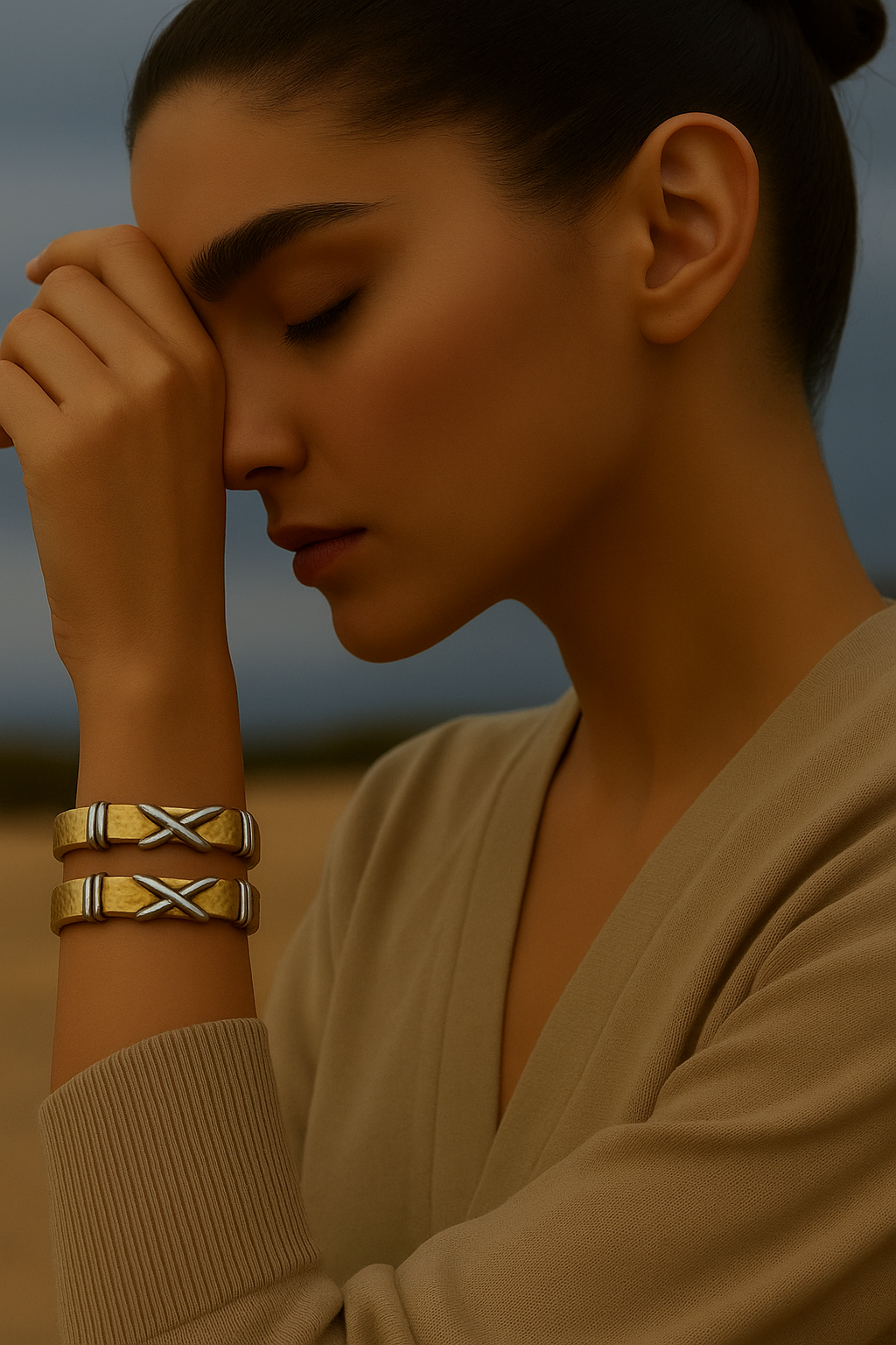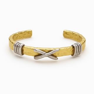 El işçiliği ile üretilen bu gold renk bileklik, antik dokusu ve ince hatlarıyla modern sadeliği birleştirir. Üzerinde silver renk detaylar vardır.