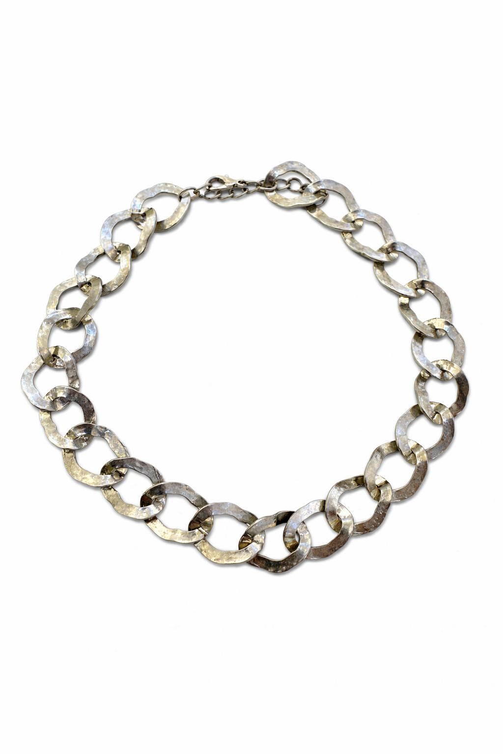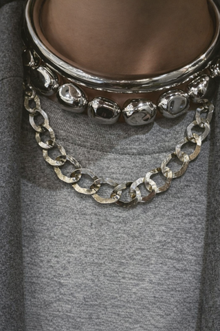 Modern ve güçlü duruşu ile öne çıkan bu kolye, bronz üzeri gümüş kaplama yapısıyla parlak ve şık bir görünüm sunar. Günlük kombinlerden gece stiline kadar tek başına da katmanlı kullanımlarda da çok yakışır.