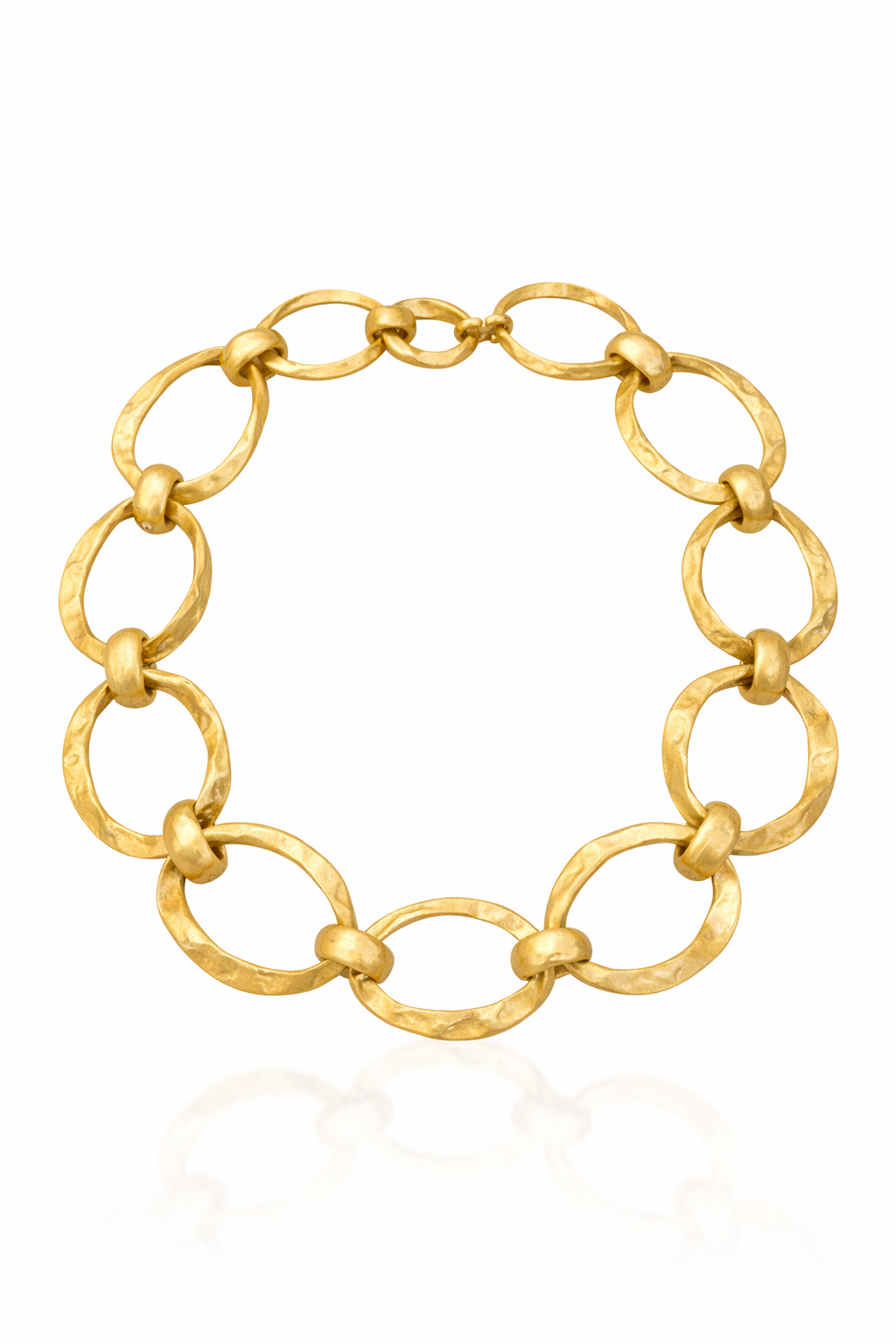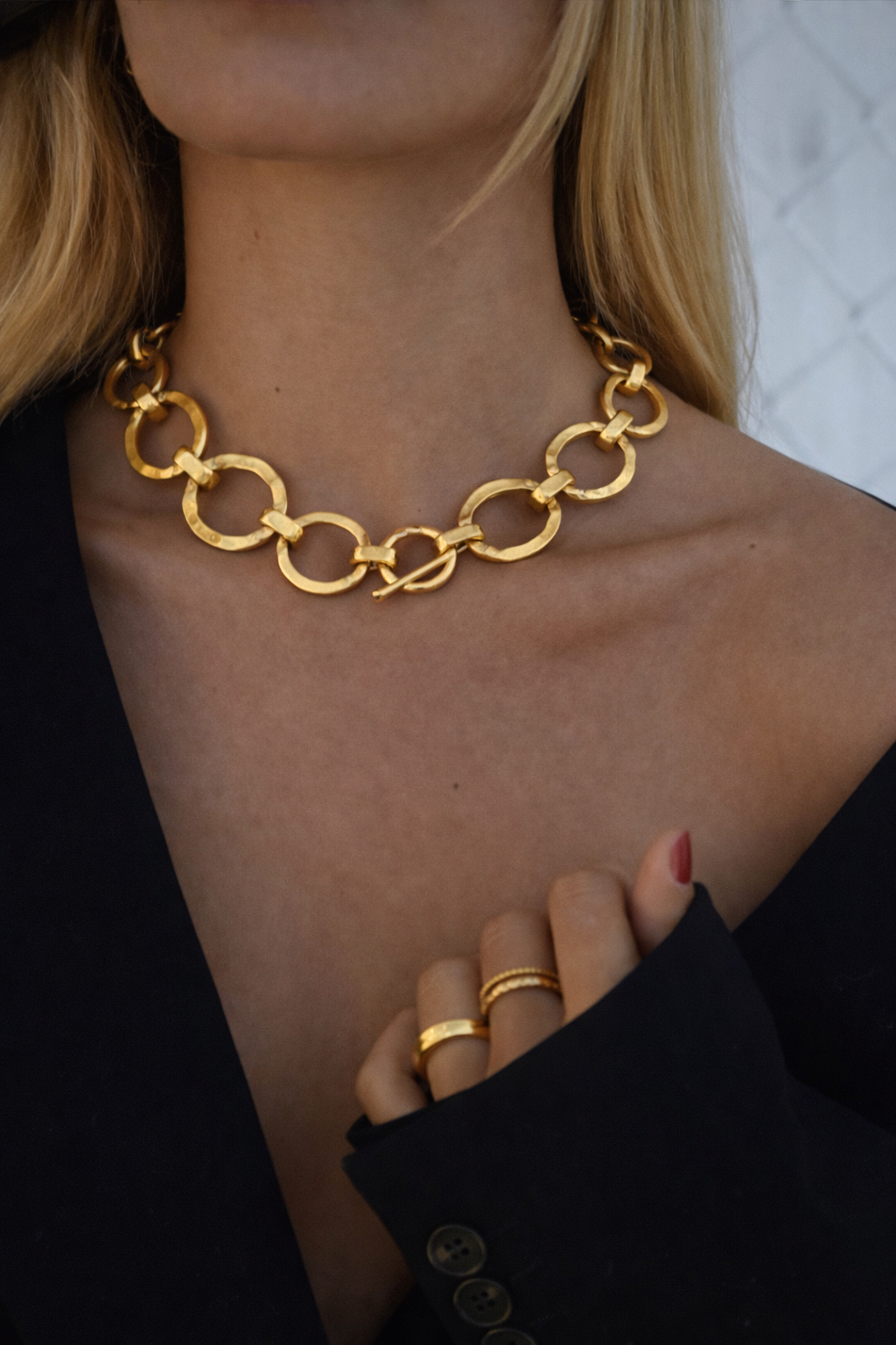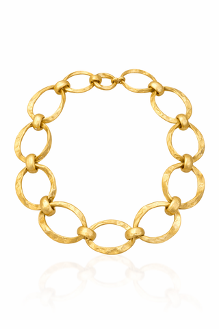 Güçlü ve modern duruşu olan bu büyük halkalı kolye, mat gold dokusu ve el işçiliğini andıran dövme yüzeyiyle kombinlere anında karakter katar.