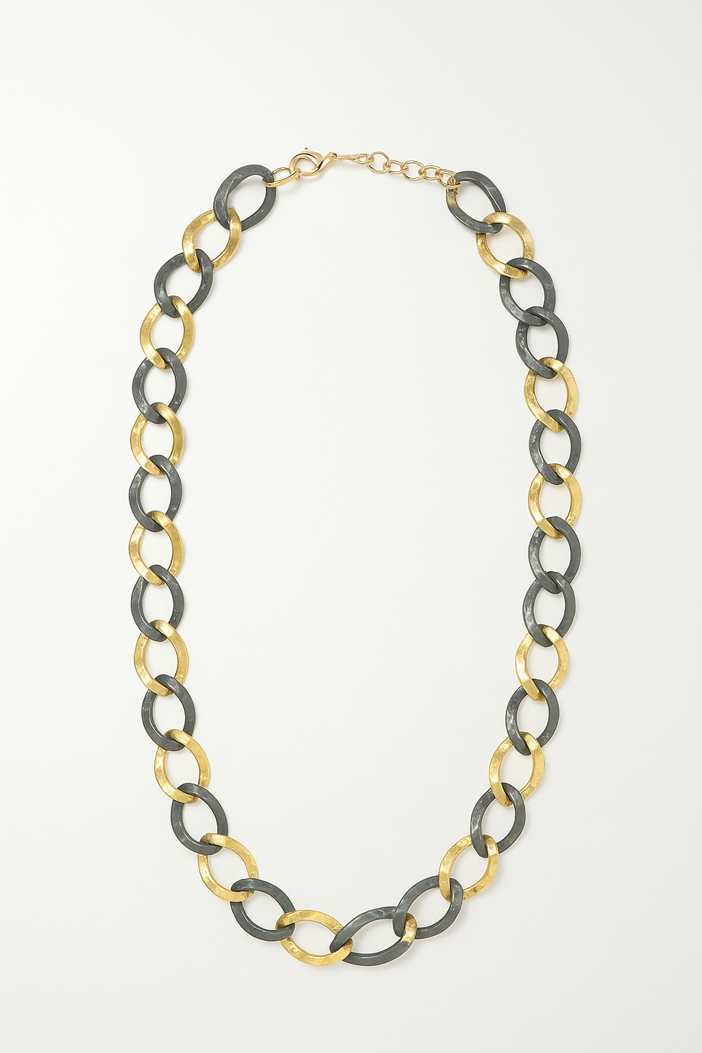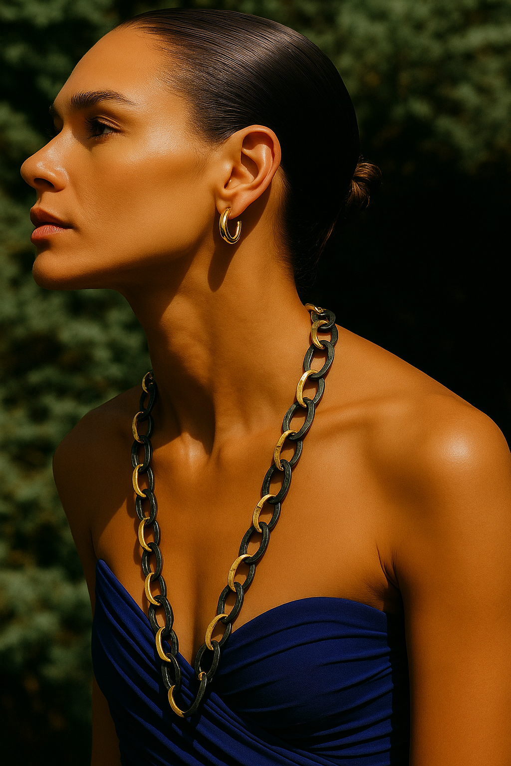 Bronz üzeri altın kaplama detaylarla tasarlanan bu uzun kolye, modern ve zarif çizgileri bir araya getirir.
