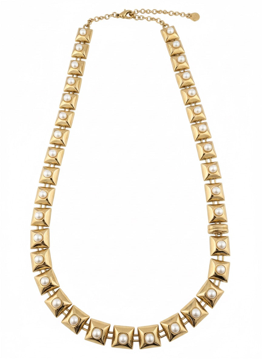 Modern Klasik Tasarım: Her biri özenle tasarlanmış kare formlu bağlantılar ve ortasına yerleştirilmiş doğal incilerle bu kolye, klasik zarafeti modern bir dokunuşla birleştiriyor. Boynunuzda zarif bir açıklama yaparken, her kombine sofistike bir hava katıyor.