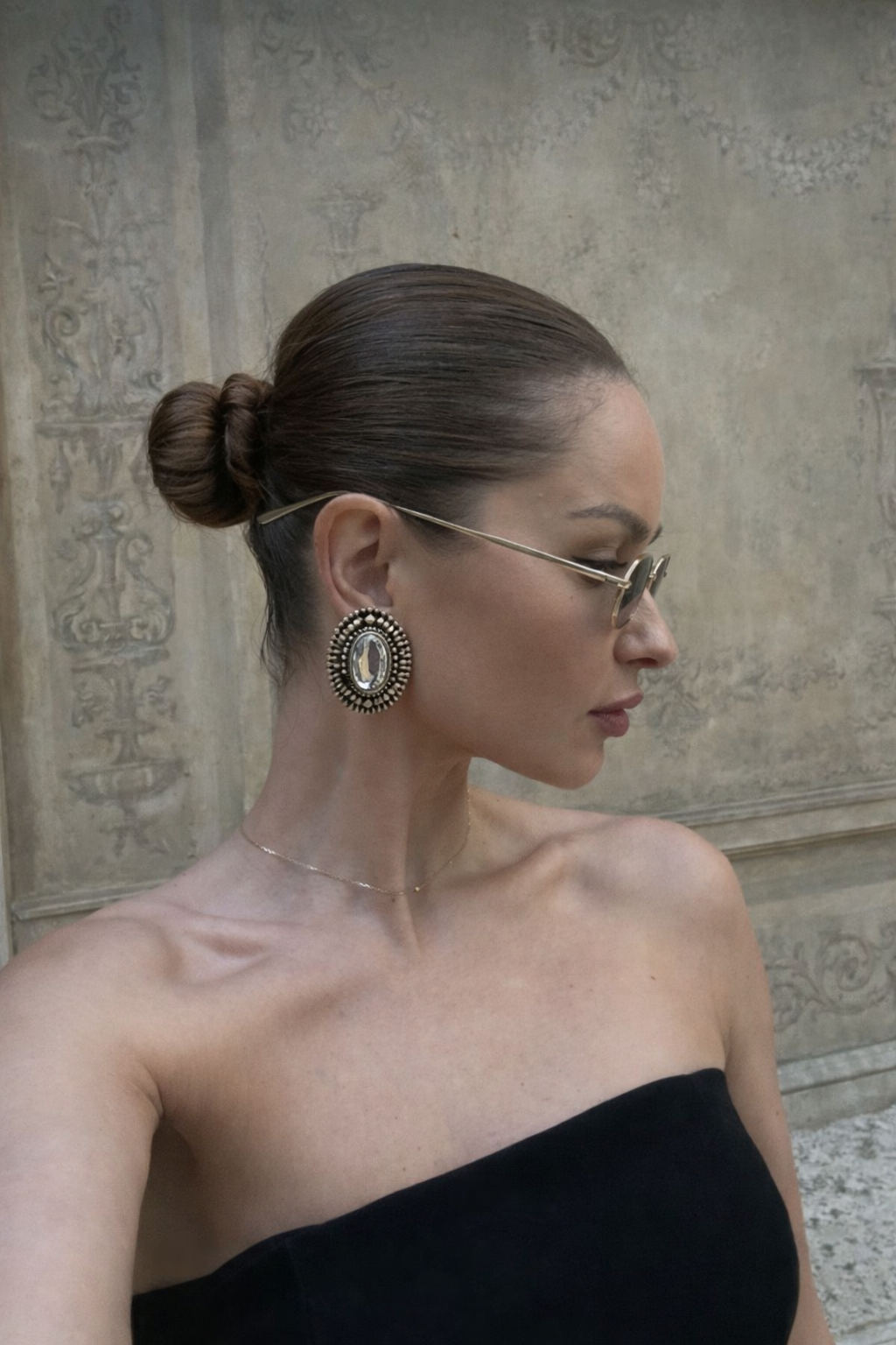 Zarif detayları ve ışığı yakalayan taş formuyla vintage esintili bu orta boy küpe, şıklığı sade bir güçle tamamlar. Kulakta dengeli duruşu sayesinde hem gündüz hem akşam kombinlerine rahatça uyum sağlar.
