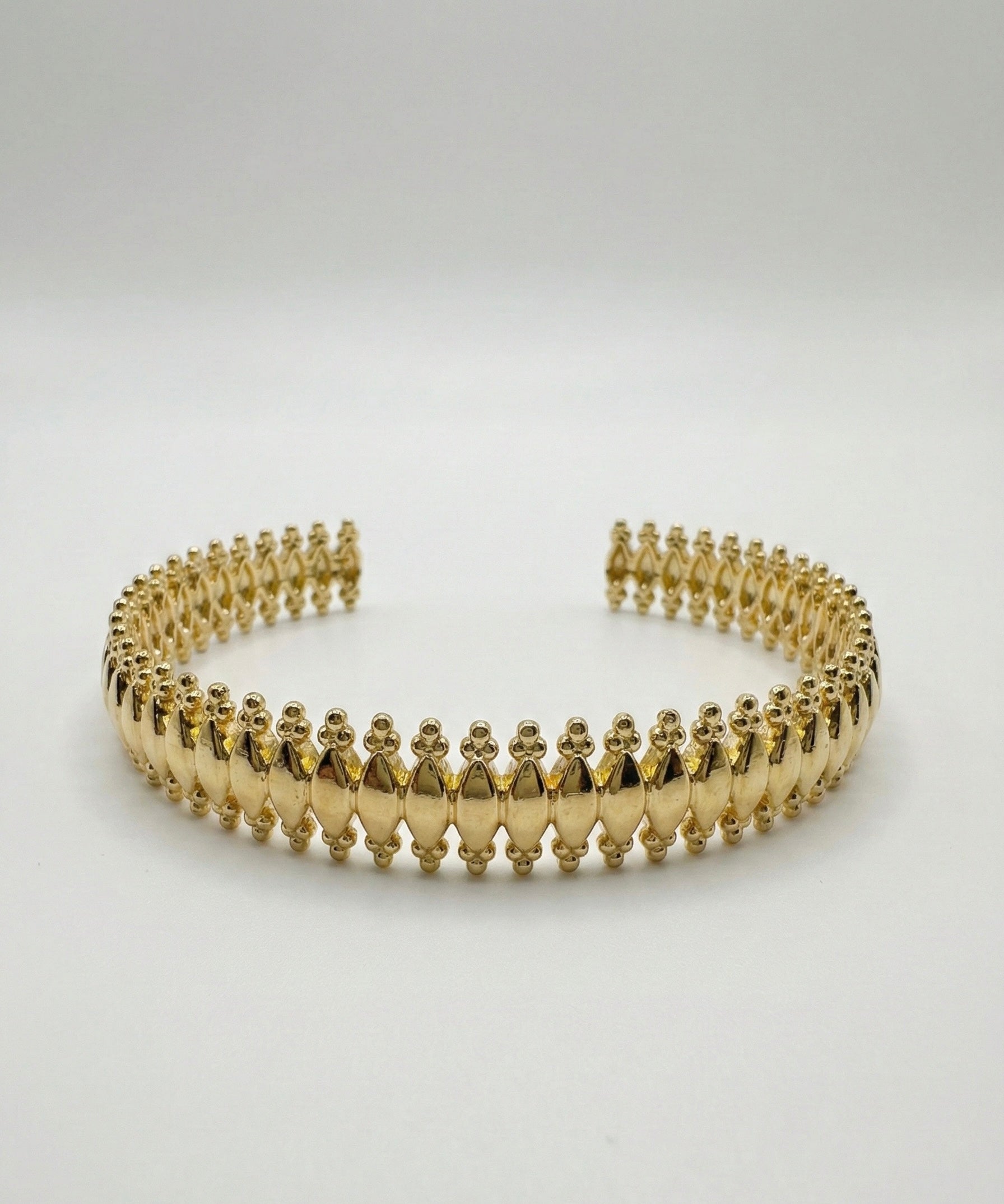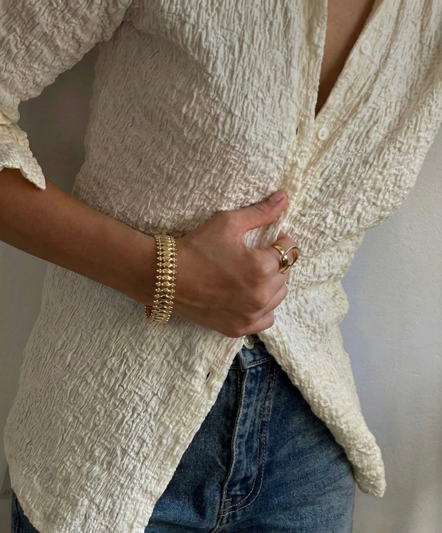 El işçiliğiyle oluşturulan organik dokusu sayesinde bu bronz üzeri altın kaplama bileklik, ışığı her açıdan farklı yansıtır.