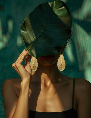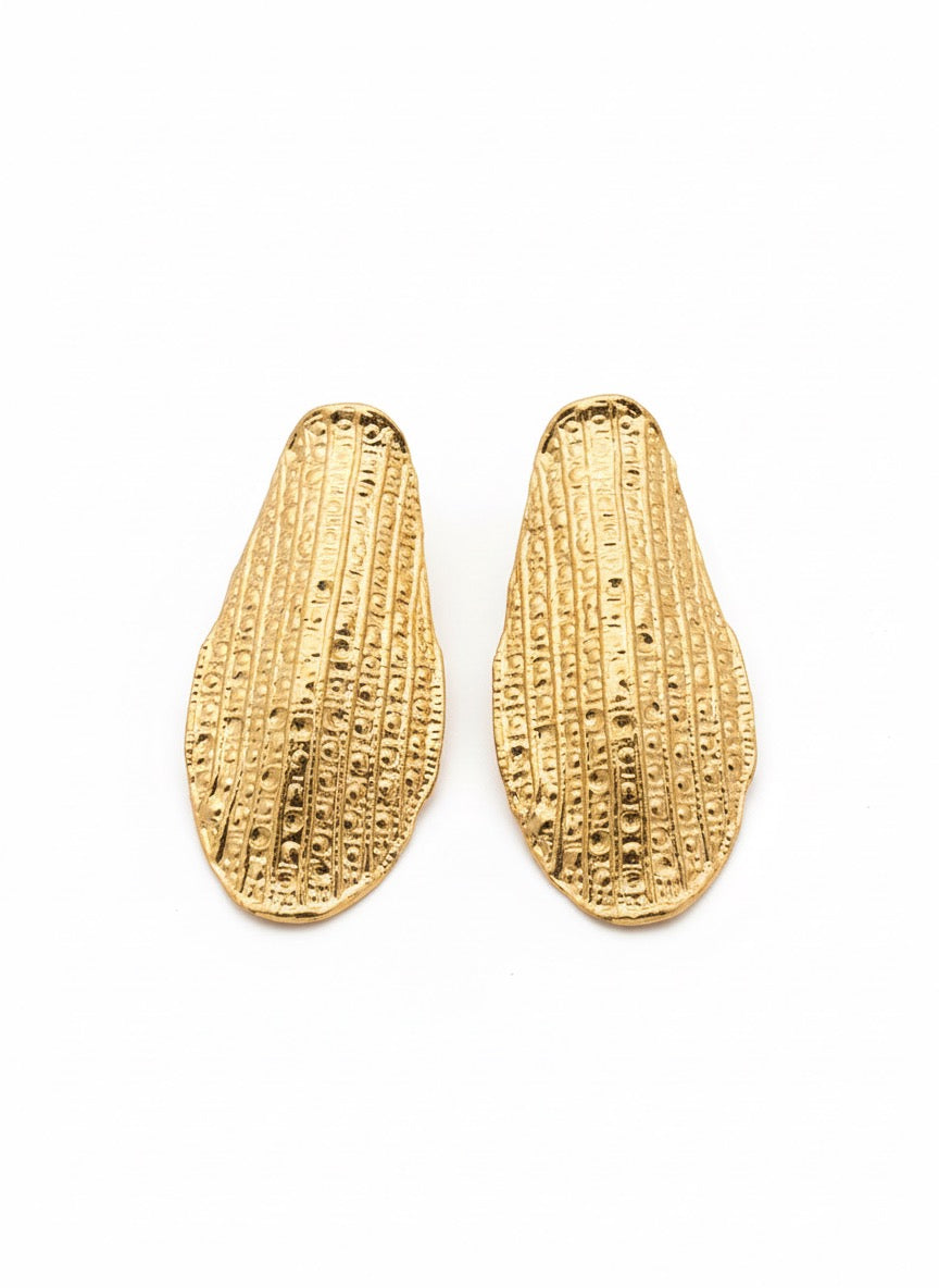 Golden Terra küpeler; el işçiliği hissi veren yüzeyi ve doğal siluetiyle güçlü, özgün ve karakter sahibi bir tasarım sunar. Hem sade kombinlere dokunuş katar hem de özel günlerde gösterişli bir tamamlayıcıya dönüşür.