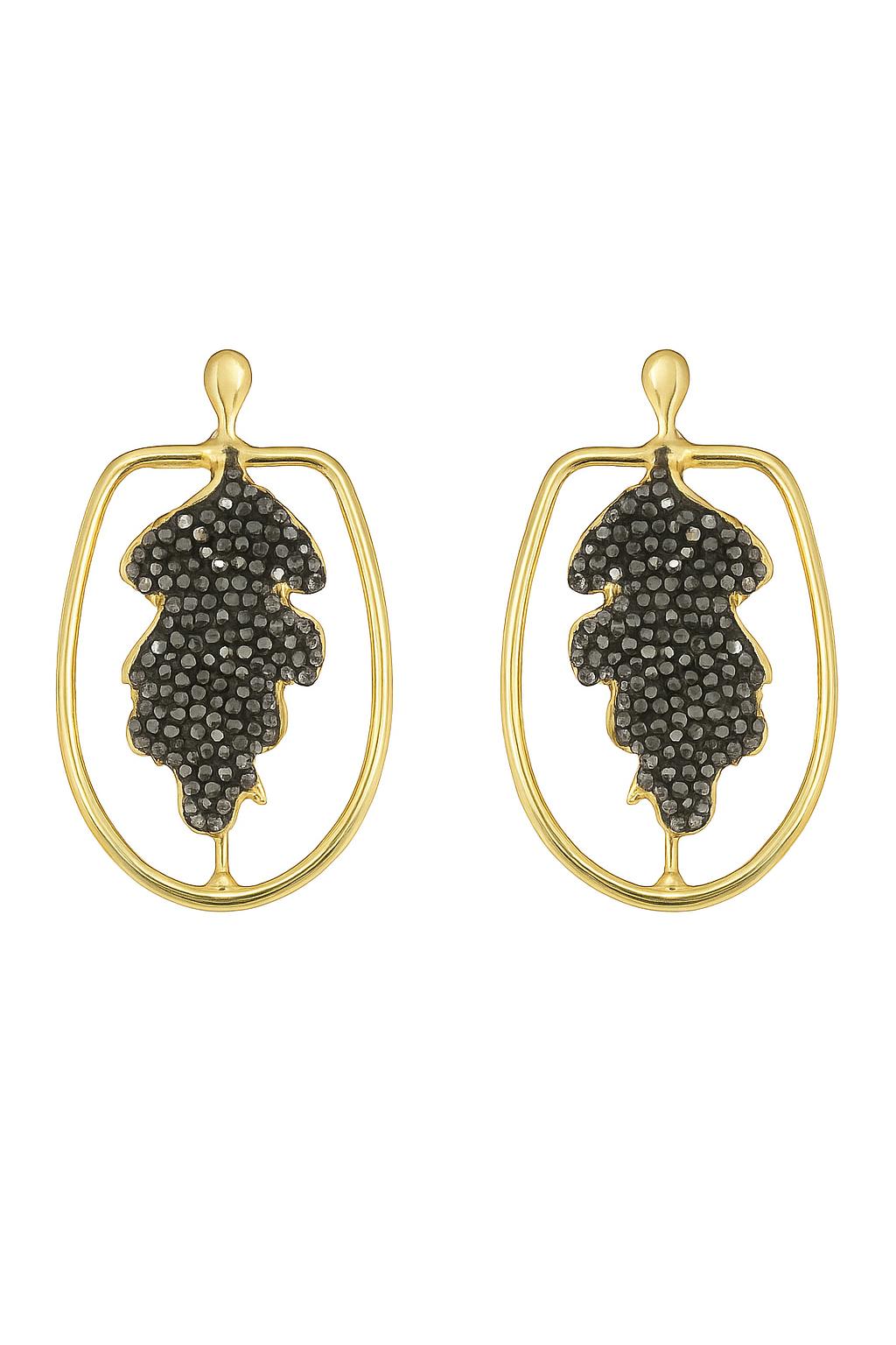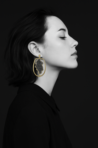 Siyah zirkon taşların güçlü ışıltısı ve geometrik formun zarafetiyle tasarlanan bu küpe, her bakışta farklı bir enerji yayıyor. Bronz üzerine altın kaplama detaylarıyla modern ve göz alıcı bir kontrast oluşturuyor.