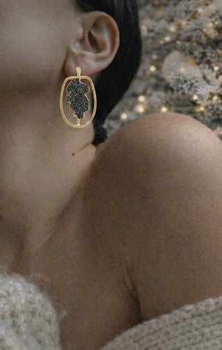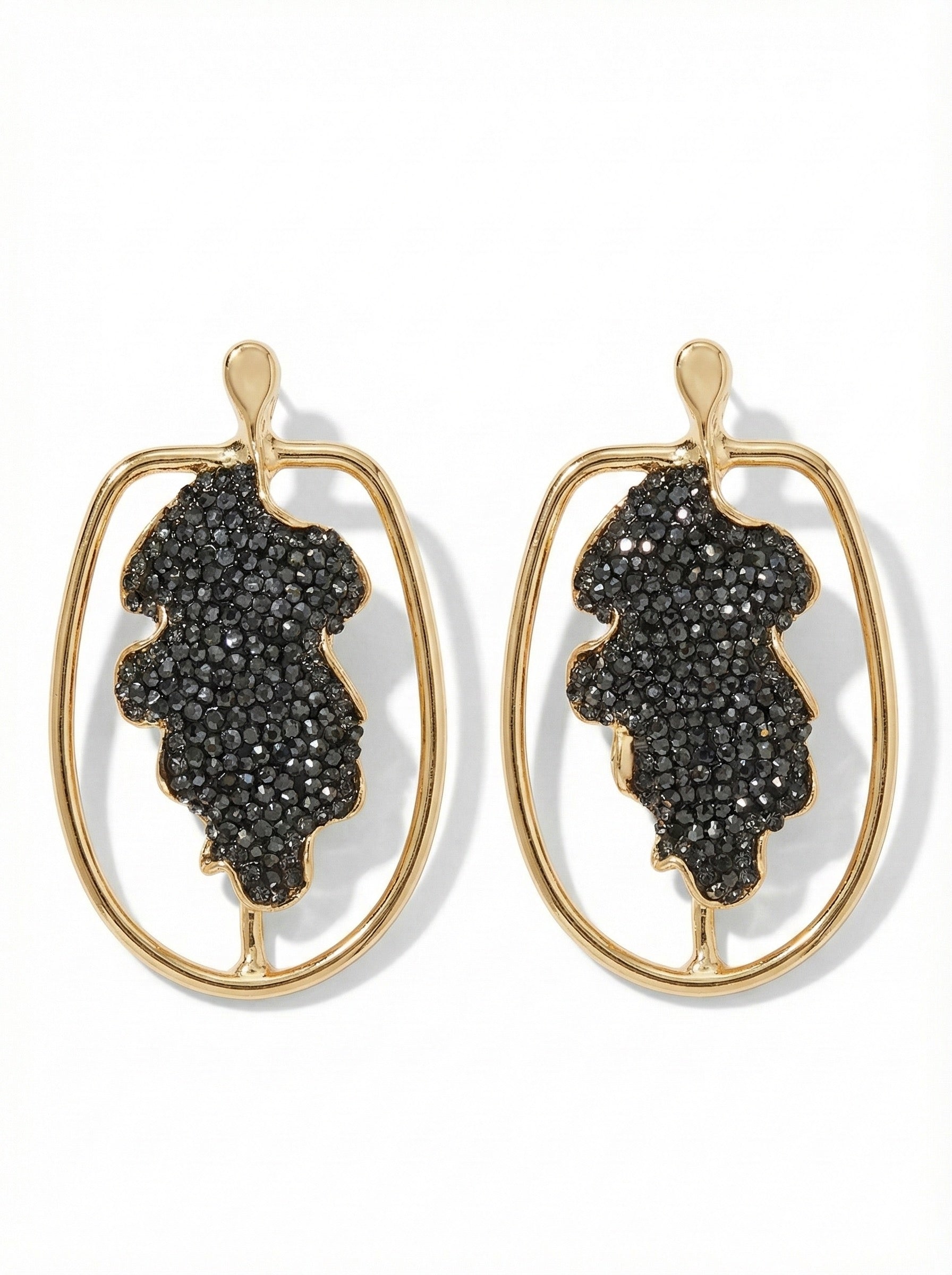 Klasik çizgilerle modern zarafeti buluşturan bu küpeler, geometrik formu ve taş detaylı üst kısmıyla dikkat çeker. Siyah zirkon taşların derin ışıltısı, altın tonlu bronz gövdeyle birleşerek sofistike bir kontrast yaratır. Gündüzden geceye geçişte her stile uyum sağlayacak kadar sade ama iddialıdır.