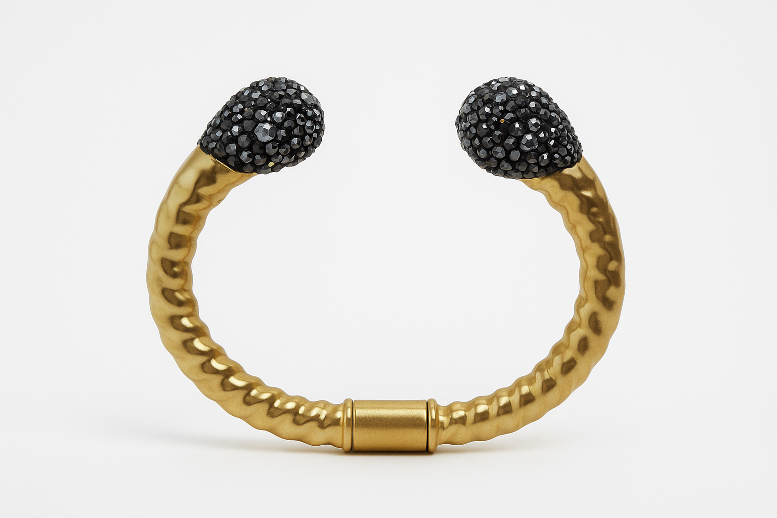 El işçiliği ile üretilen bronz üzeri altın kaplama bileklik, antik formu ve siyah zirkon taş detaylarıyla güçlü bir karakter taşır.