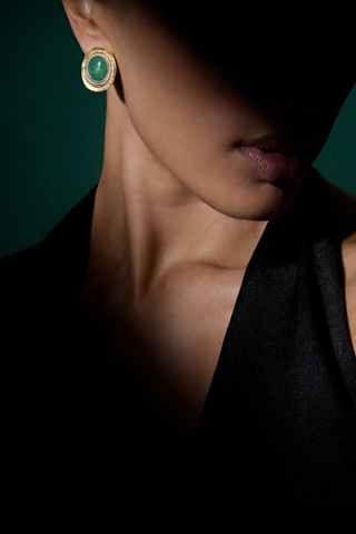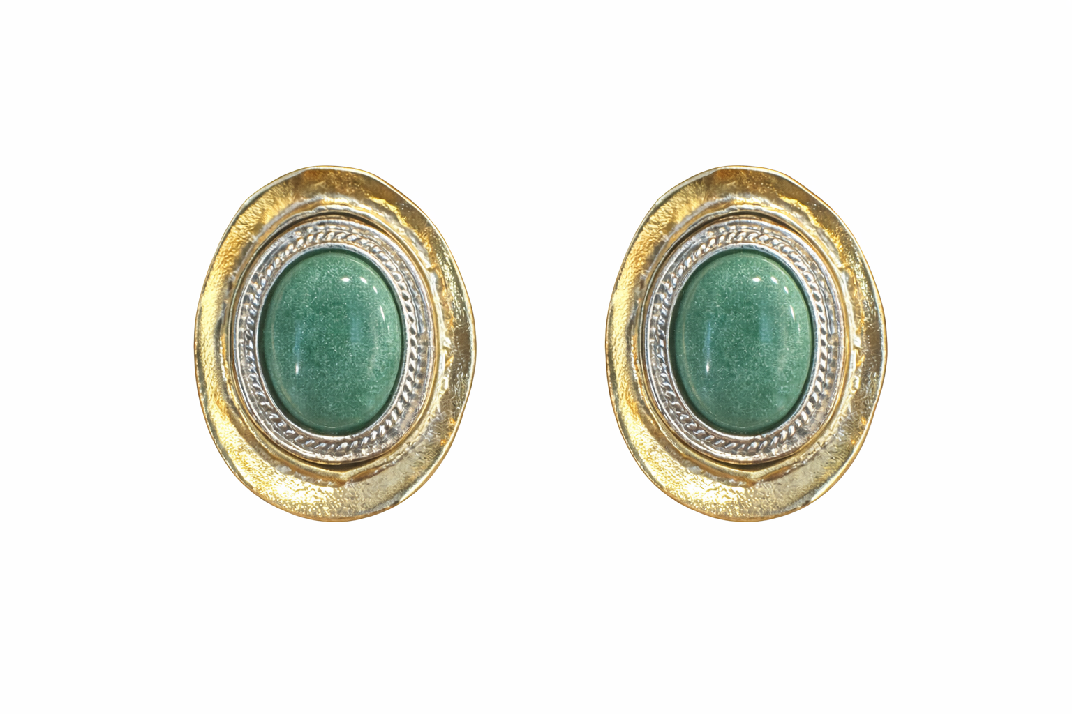 Zarif oval formu ve doğal yeşil taş detayıyla öne çıkan bu küpe, klasik şıklığı modern bir dokunuşla buluşturur. Gold ve gümüş tonlarının birlikte kullanıldığı çerçevesi, yeşil taşın doğal dokusunu ön plana çıkarırken zamansız bir görünüm sunar.