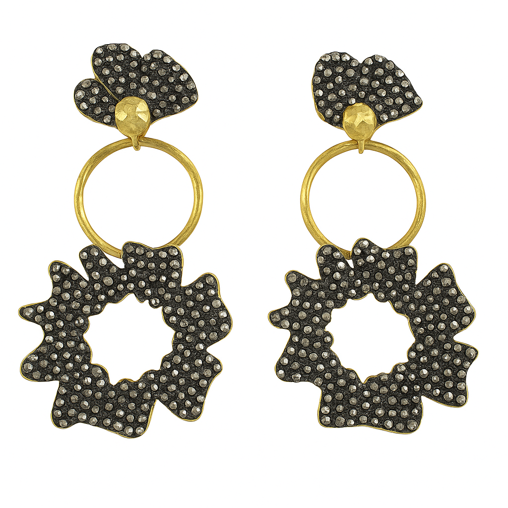 Siyah zirkon taşların güçlü ışıltısı ve kalp formun zarafetiyle tasarlanan bu küpe, her bakışta farklı bir enerji yayıyor. Bronz üzerine altın kaplama detaylarıyla modern ve göz alıcı bir kontrast oluşturuyor.