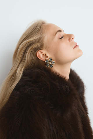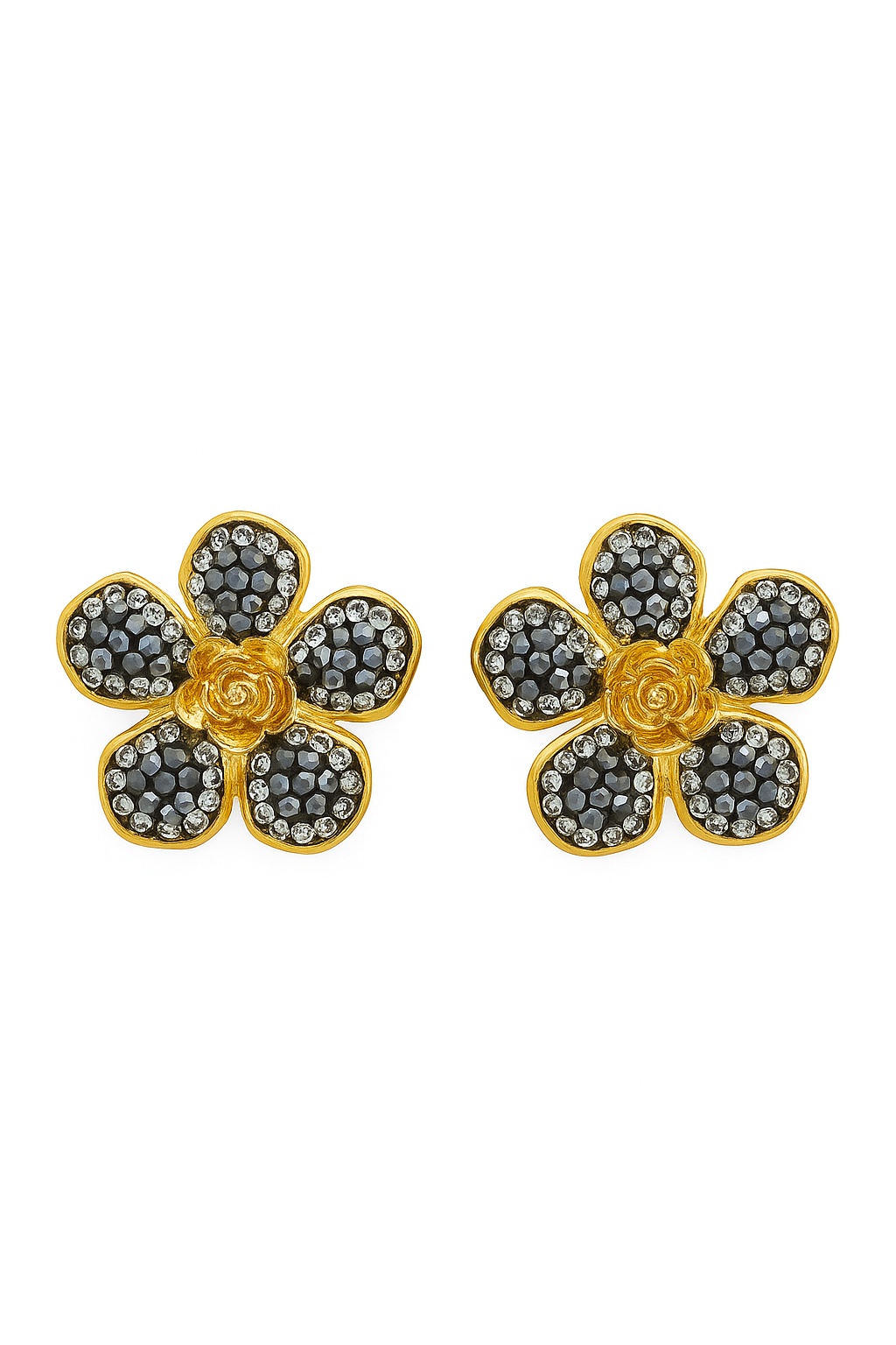 Siyah zirkon taşlarıyla, ışıl ışıl taşlarla bezeli bu küçük boy küpe, zarif bir çiçek formundan ilham alıyor. Hem doğal hem ışıltılı görünümüyle gün ışığını yakalıyor ve her harekette enerjisini yansıtıyor. Şık davetlerden sade kombinlere kadar her stile sıcak bir dokunuş.