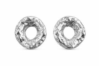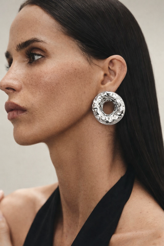 Heykelsi ve organik formuyla öne çıkan gri gümüş halka küpe, modern ve güçlü bir stil sunar. Düz olmayan dokulu yüzeyi ışığı farklı açılardan yansıtarak karakterli bir görünüm yaratır. Kulakta dengeli duruşu sayesinde tek parça ile iddialı bir etki sağlar.