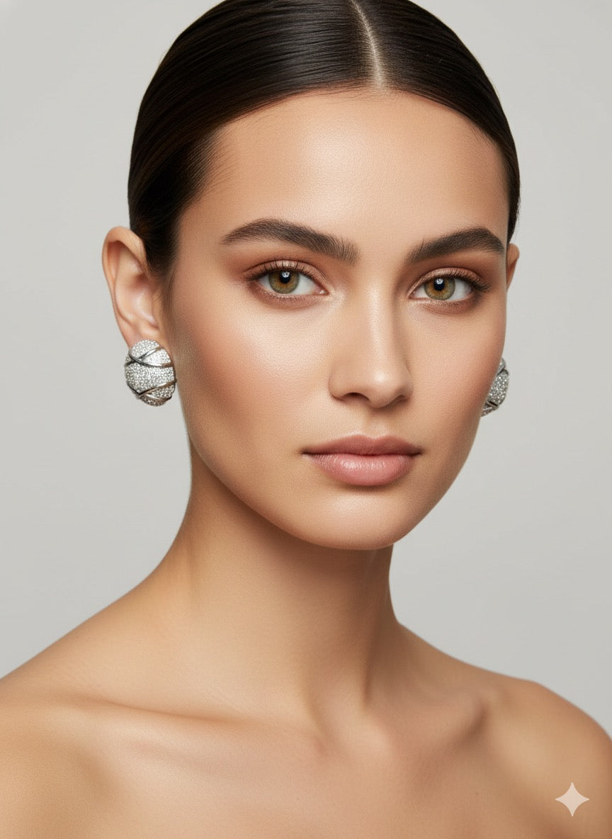 Göz kamaştırıcı Pave tekniğiyle tamamen kaplanmış bu kubbe küpeler, zarafeti ve modern tasarımı bir araya getiriyor.