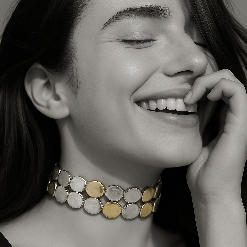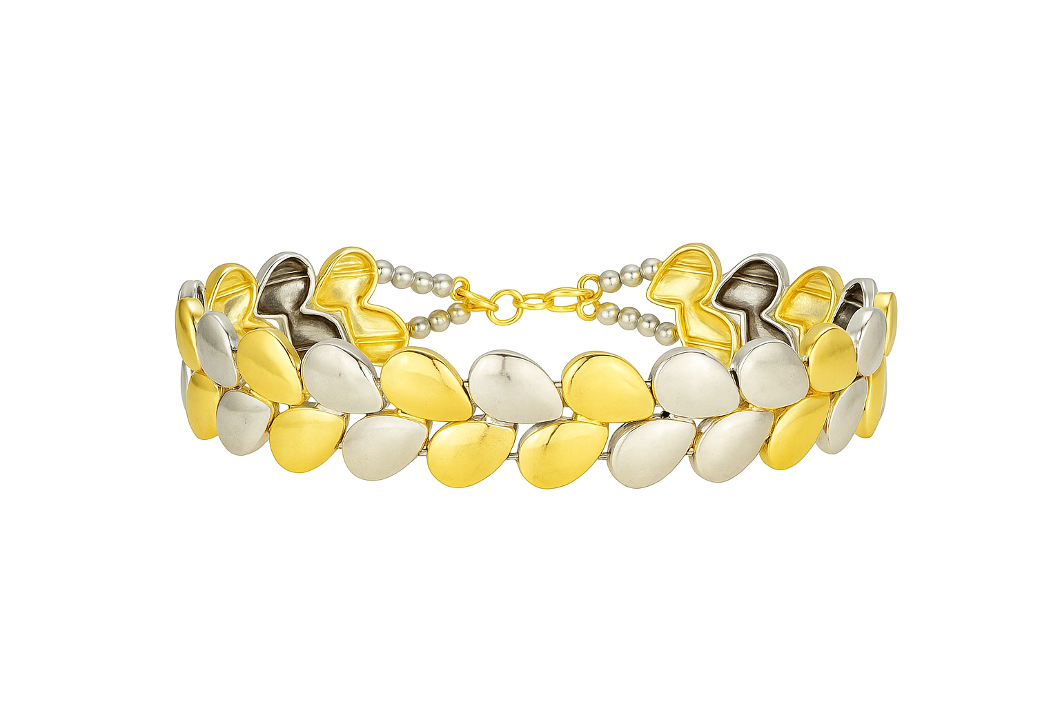 El işçiliği ile şekillendirişmiş dokulu halkaların modern yaratımıdır. Hem günlük şıklıkta hem de özel davetlerde rahatça kullanılabilecek bir parçadır. Bronz üzeri altın kaplamadır.
