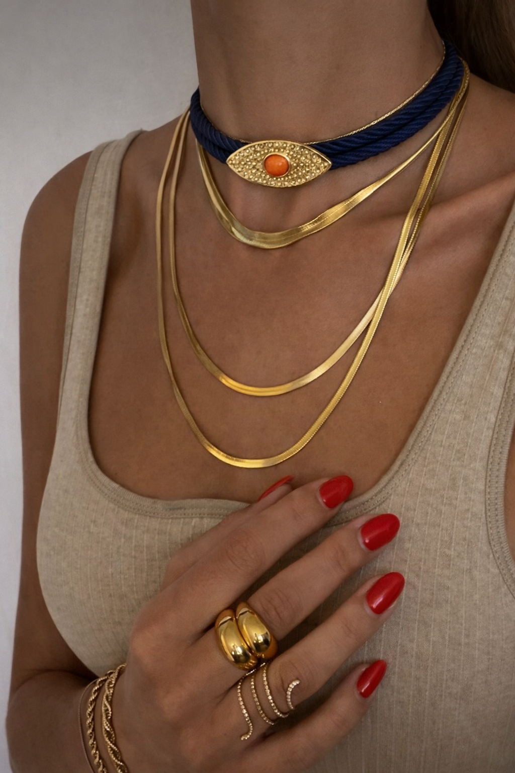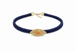 Göz formundaki detaylı altın kaplama figürü ve lacivert çift kat ip tasarımıyla öne çıkan bu choker kolye, güçlü ve modern bir duruş sunar. Boynu saran formu sayesinde tek başına dikkat çekerken, katmanlı kolyelerle birlikte kullanıma da uygundur.