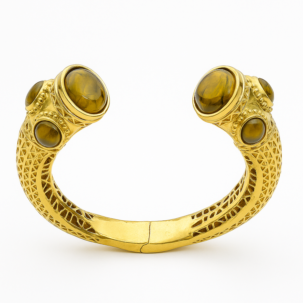Kaplan gözü taşlarının büyüleyici tonlarıyla zenginleştirilen bu altın bilezik, antik dokularla modern formu bir araya getiriyor. El işçiliği detayları, her ışıkta farklı yansıyan sıcak bir ışıltı sunarken, güçlü enerjisiyle stilinize anlam katıyor. Günlük kullanımda da özel davetlerde de dikkat çekici bir tamamlayıcı.