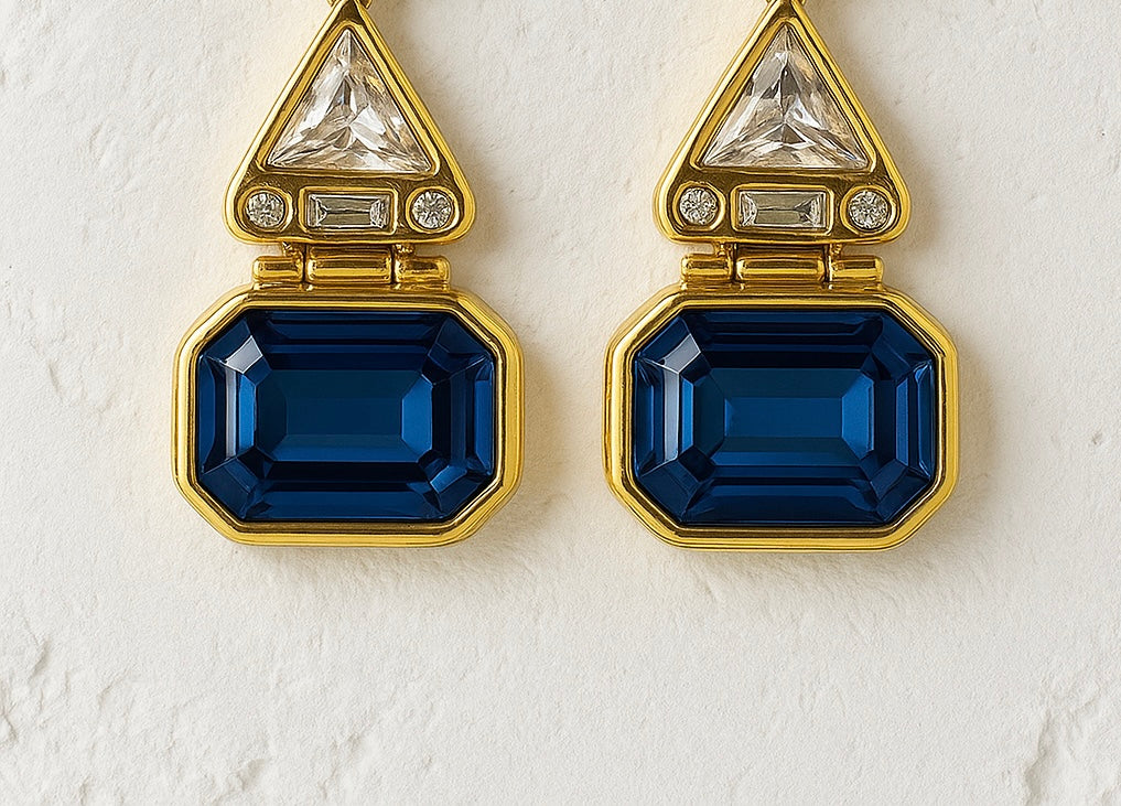 Retro-şık geometrisi ve derin lacivert taşıyla güçlü bir duruş: Aurora Geo, gold ton çerçevede yer alan dikdörtgen kesim lacivert taş ve üst bölümde üçgen kesim parlak kristallerle ışıltıyı dengeler. Gündüzden geceye tüm kombinlere heykelsi bir vurgu ekler.