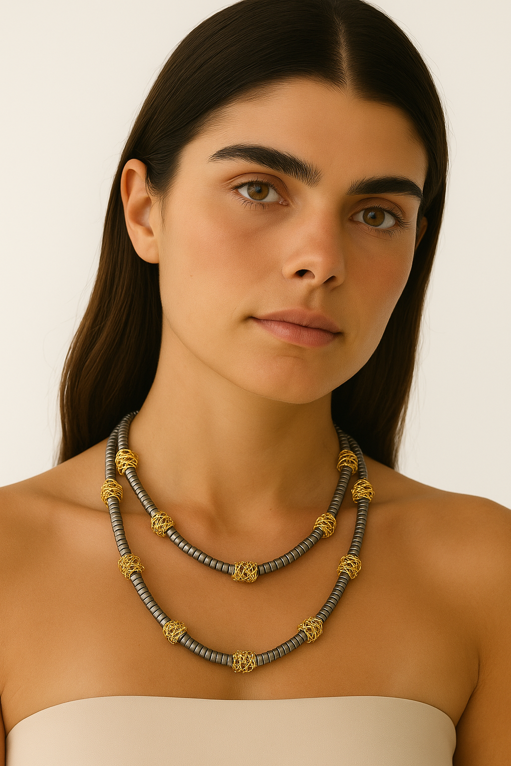 Doğal taşların gücüyle zarafetin birleşimi. Bronz boncuklarla tasarlanan çift katlı kullanılan Solaris Kolye sade ama iddialı bir stil yaratıyor.