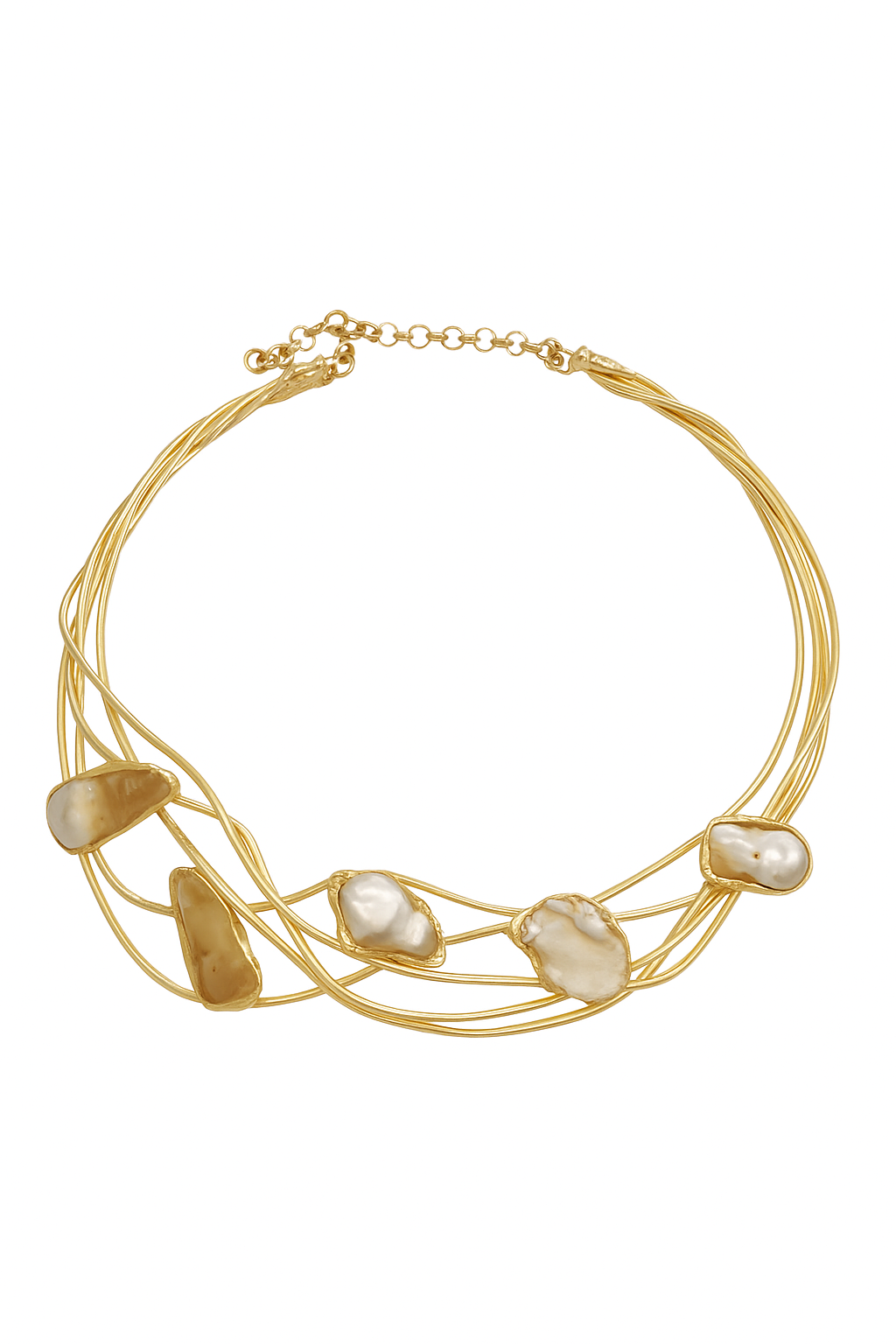 Bronz üzeri altın kaplama, zarif ve güçlü bir duruşu bir araya getiriyor. Çoklu katmanlı, hafif yapıda. Parlak altın ton ve asimetrik inci vurguları ile tasarlandı. Ayarlanabilir uzatma zinciri ile konforlu kullanım sağlar.