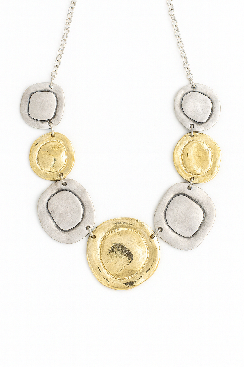 Altın ve gümüş tonlarının uyumuyla tasarlanan bu kolye, dokulu metal yüzeyiyle ışığı zarifçe yansıtır.