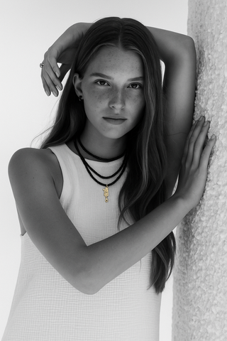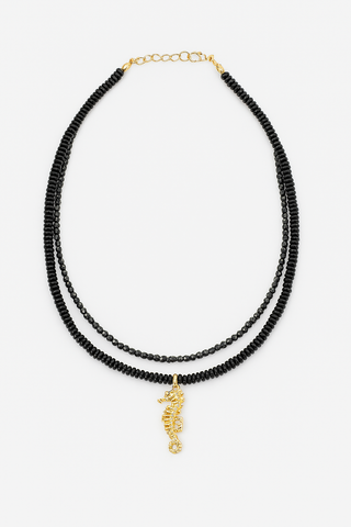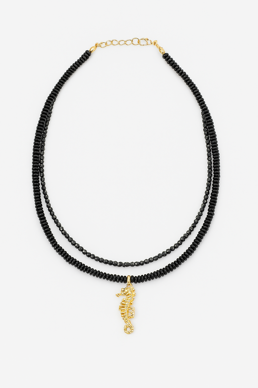 Siyan boncukların zarif uyumu,altın deniz atı figürüyle buluşturan bu kolye, denizden ilham alan modern ve özgün bir tarz sunar.