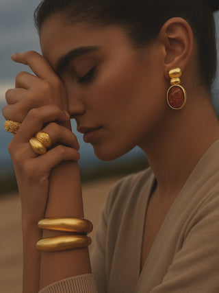 Altın kaplama gövdesi ve iç ışıltısıyla büyüleyen kehribar taşı, her kombine sıcak bir dokunuş katıyor.