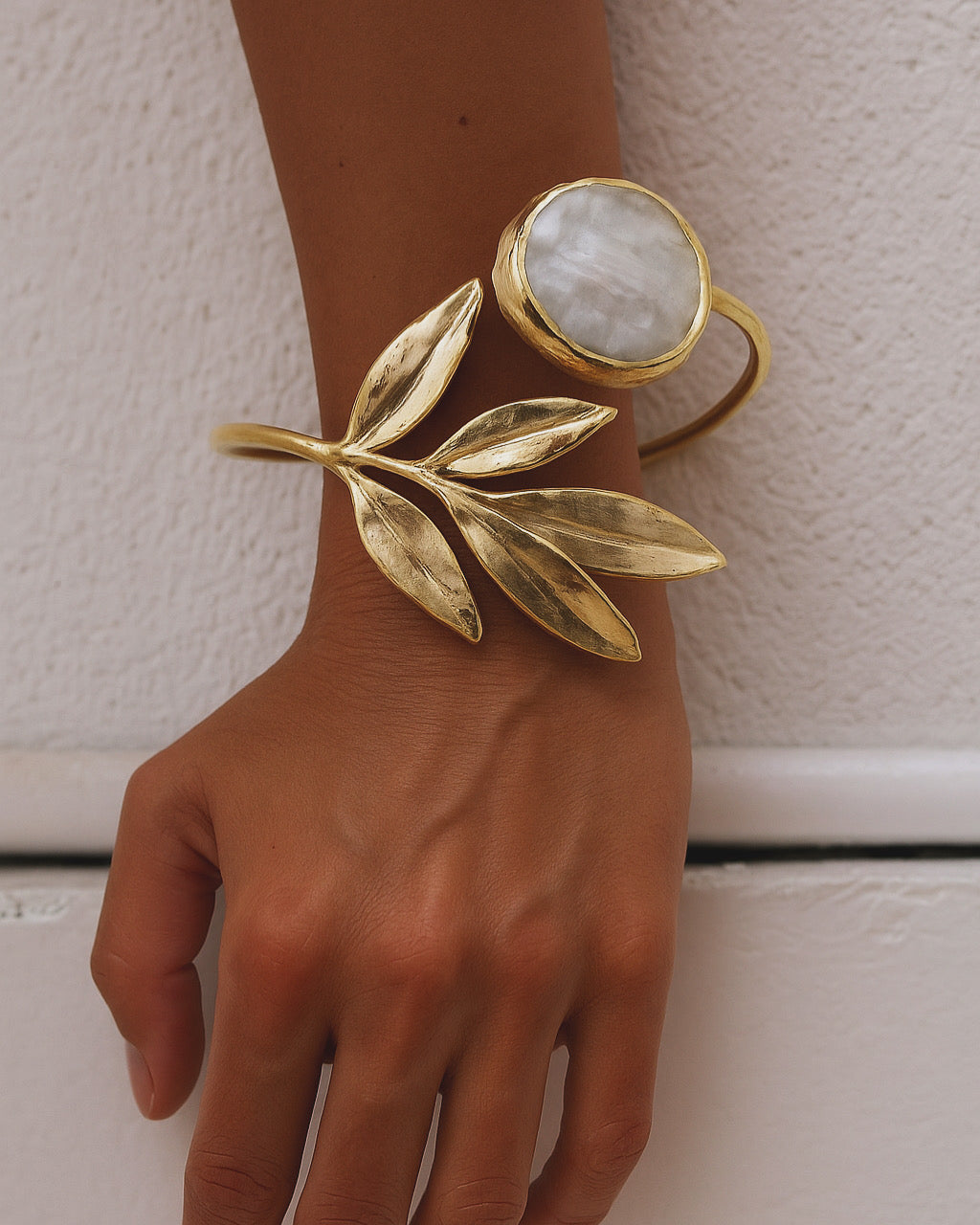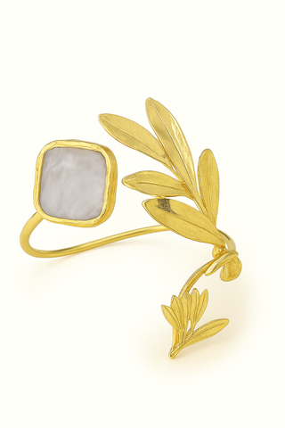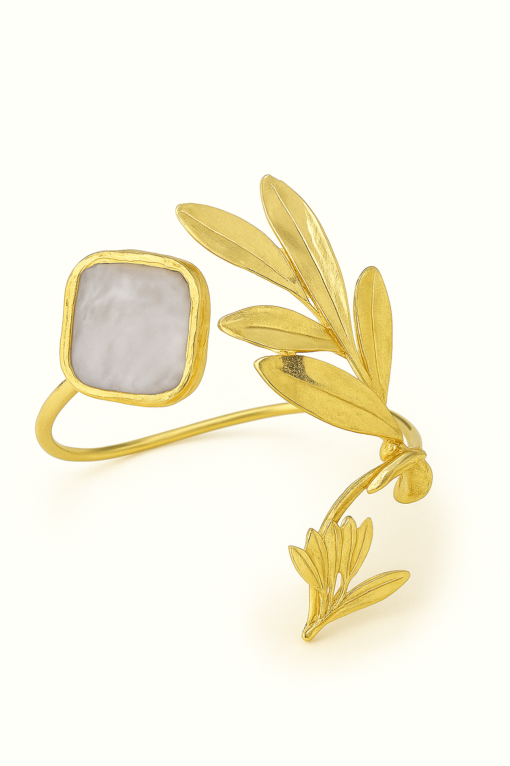 Zeytin dalı formundan ilham alınarak tasarlanan bu bronz üzeri altın kaplama bileklik, güçlü taş detaylarıyla doğallığı ve asilliği bir arada sunar.