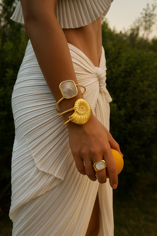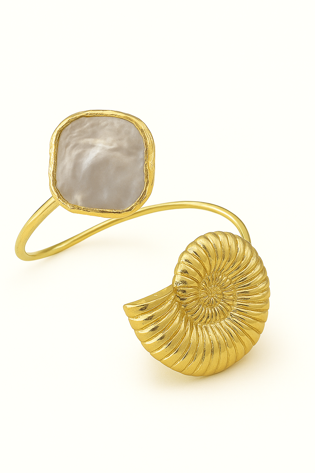 El işçiliği ile üretilen bu bronz üzeri altın kaplama bileklik, antik dokusu, deniz kabuğu detaylarıyla modern sadeliği birleştirir.