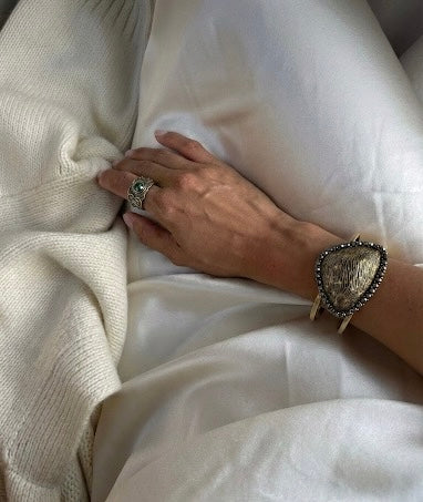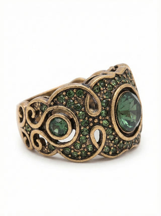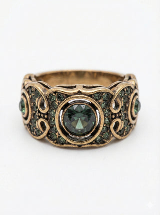 Yüzüğün kalbinde, derin ve gizemli parıltısıyla dikkat çeken büyük, yuvarlak kesim koyu yeşil bir kristal yer alır. Bu merkezi taşı çevreleyen ve yüzüğün gövdesine yayılan daha küçük yeşil taşlar, tasarıma büyüleyici bir doku ve ışıltı katar. Geniş ve gösterişli formuyla tek başına tüm dikkatleri üzerine çeken bu "statement" parça, hem özel gece kombinlerinizin hem de iddialı günlük stilinizin vazgeçilmez tamamlayıcısı olacak.