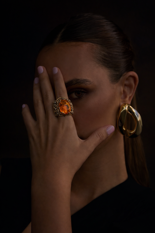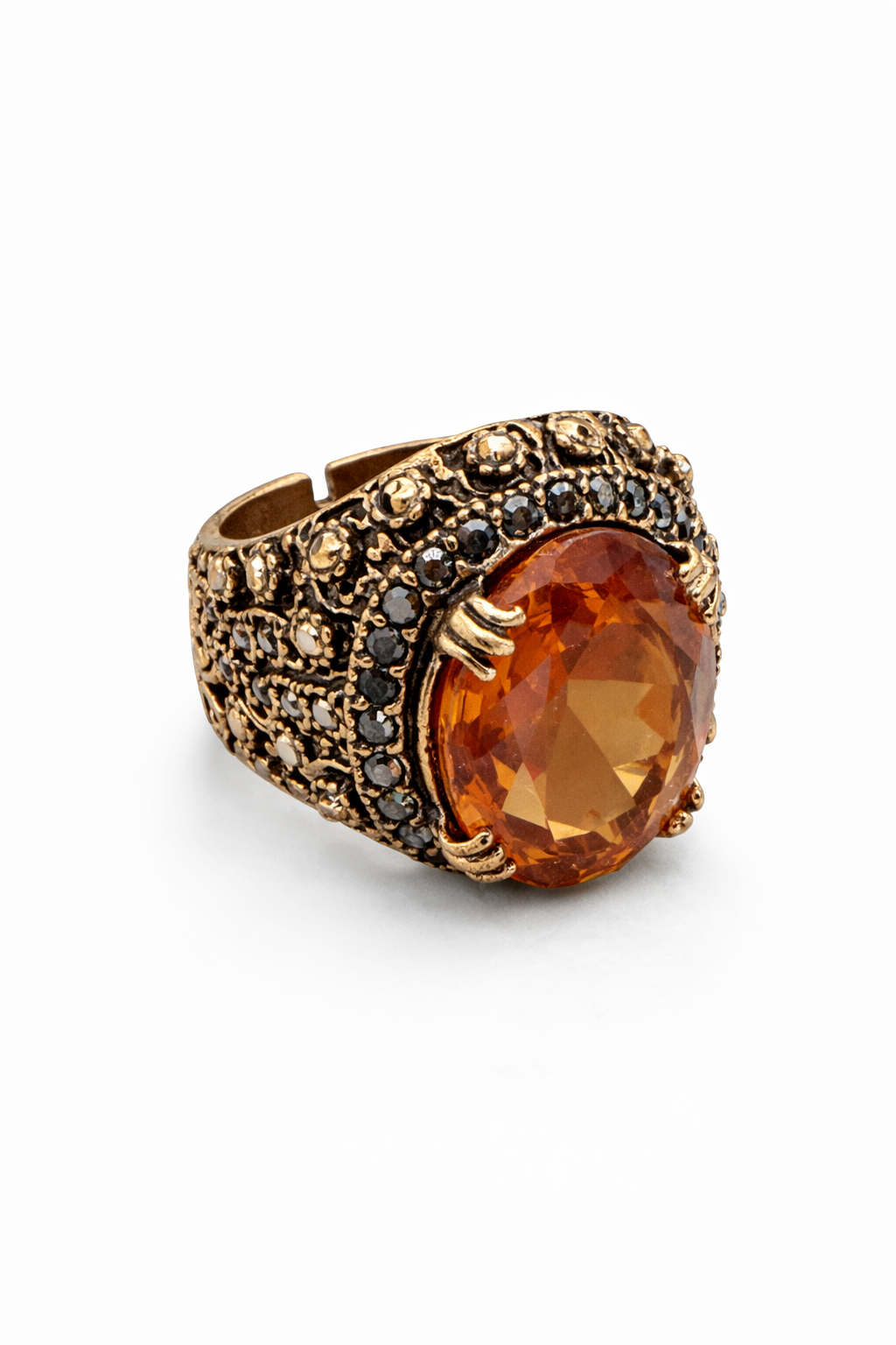 Gösterişli formu ve vintage eskitme dokusuyla tek başına bile tüm kombinin yıldızı. Merkezdeki amber/turuncu tonlu büyük taş, ışık aldıkça derinleşen bir parıltı verir; çevresindeki koyu taş detayları ise yüzüğe karakterli, güçlü bir görünüm katar.